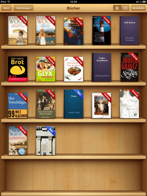 Der Preis der einzelnen E-Books ist nicht wesentlich günstiger als der der gebundenen Ausgaben. Bei iBook habe ich allerdings den Vorteil, dass ich nicht nur die Inhaltsangabe lesen, sondern mir auch einen Buchauszug herunterladen kann. So habe ich die Möglichkeit die ersten Seiten zu lesen und im Anschluss daran zu entscheiden, gefällt mir das Buch oder nicht. Auf dem oben abgebildeten Bücherregal sind meine iBook Bücher und genauso verfüge ich über ein Kindle Bücherregal auf meinem iPad.