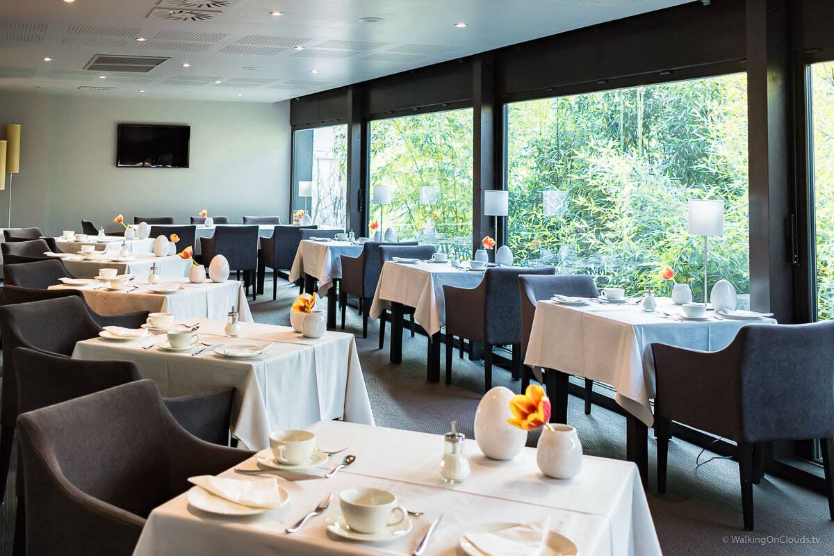 Die stilvoll gedeckten Tische des Restaurants bieten einen schönen Ausblick auf den Garten. An einigen Wänden des Restaurants hängen Flachbildschirme, die mit einer Live-Kamera in der Küche verbunden sind. Der Gast hat so die Gelegenheit bei der Zubereitung und dem Anrichten der Speisen zuzusehen.