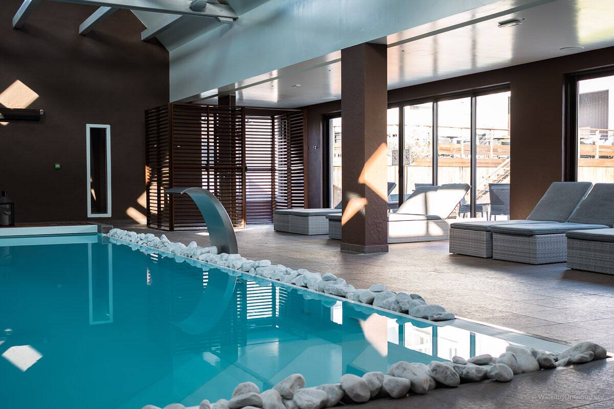 Ein Innen- sowie ein beheizter Außenpool laden zum Schwimmen ein. Zudem verfügt der Wellnessbereich über eine große Auswahl von Saunen und Dampfbad, sowie einer Salzgrotte. Die Ruhebetten vor den großen Glasfenstern, sowie die Liegen auf der Terrasse, laden zum Träumen ein.